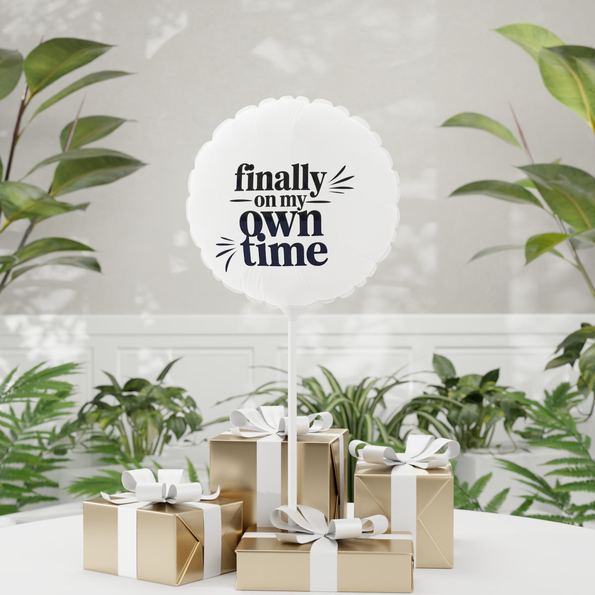 Celebrate independence with this statement balloon that boldly reads "Finally On My Own Time". Perfect for any special occasion demanding unique decorations.