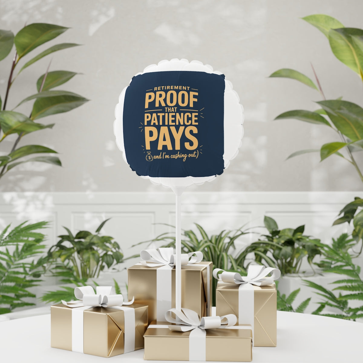 Celebrate retirement with our unique 22in or 11in Mylar Ballons, featuring an inspiring "Proof That Patience Pays" message. Perfect for retirement parties.