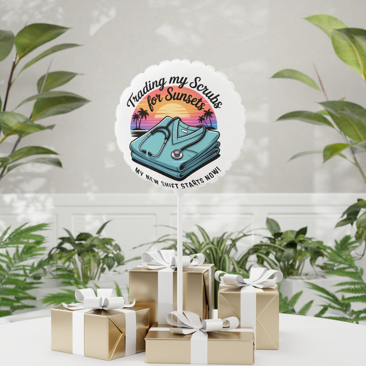Brighten up any occasion with these vibrant Mylar Ballons featuring a fun "Trading my Scrubs for Sunsets" design. Perfect for celebrations and events.